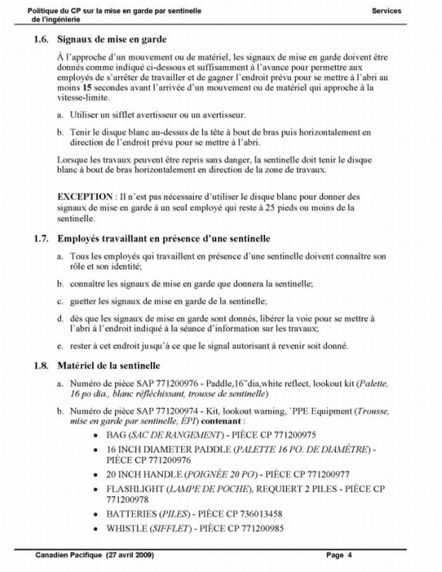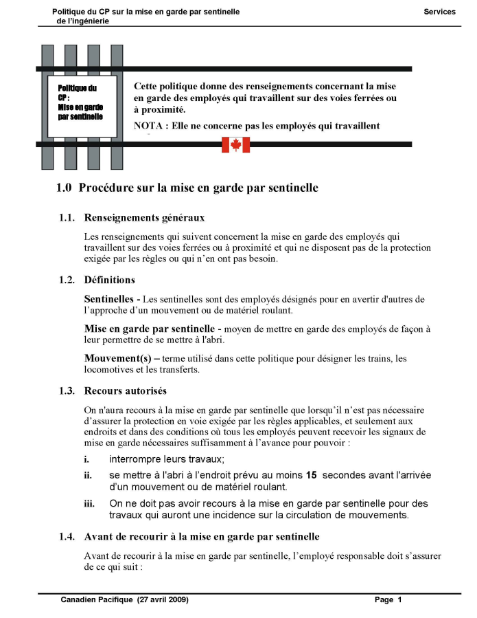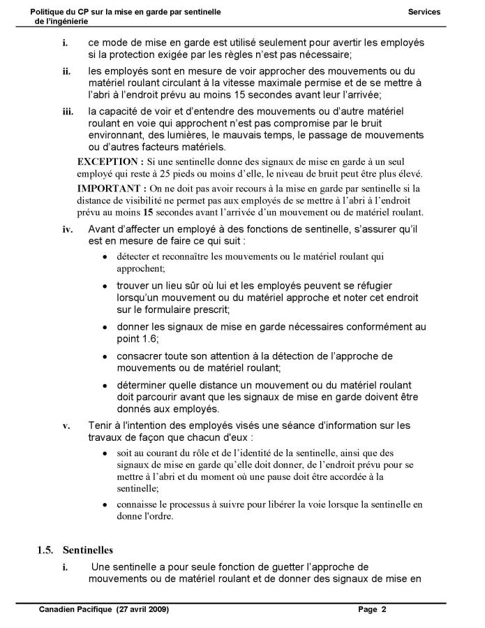 Dans sa réponse à l'instruction de RHDCC sur l'élimination des dangers, CN faisait part du maintien de la suspension de la protection par sentinelle comme méthode de protection sur toutes les voies doubles de catégorie 5 des subdivisions de Kingston et d'Oakville et d'une partie de la subdivision de Saint-Hyacinthe. La protection par sentinelle sur toutes les autres voies est régie par les Instructions générales d'exploitation, qui sont plus rigoureuses.