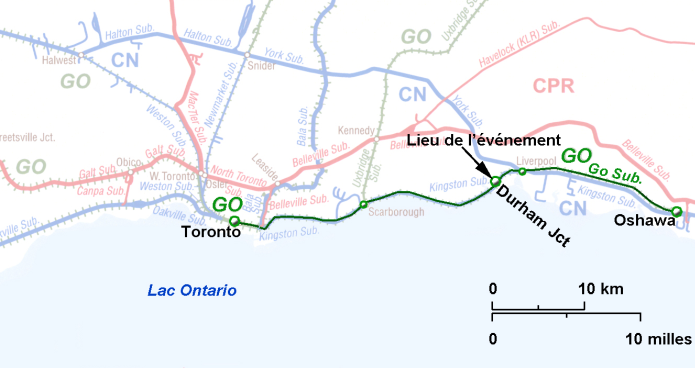 La subdivision de Kingston est formée d’une double voie et d’une voie multiple s’étendant du point milliaire 10,3 (Dorval, au Québec) au point milliaire 333,8 (Toronto). Ces voies se raccordent à la subdivision GO au point milliaire 313,9 (Durham Junction). La subdivision de Kingston est le principal corridor est-ouest du CN pour les trains de voyageurs et de marchandises dans le sud de l’Ontario. Dans la zone de l’accident, la vitesse maximale permise est de 65 mi/h pour les trains de marchandises et de 100 mi/h pour les trains de voyageurs. Les mouvements de train sur les 2 subdivisions de Kingston et GO sont régis par le système de commande centralisée de la circulation (CCC), en vertu du REFC, et surveillés par un contrôleur de la circulation ferroviaire (CCF) à Toronto.