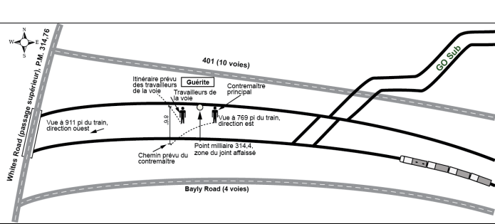 Vers 12 h 50, le contremaître principal de la voie a demandé un permis d’occuper la voie (POV) Note de bas de page 9 pour la voie nord. Le CCF, qui était en formation avec le CCF habituel, lui a demandé de rappeler après le passage du train GO vers l’ouest. Le CCF habituel supervisait le CCF en formation et ne s’est pas opposé pas à l’information donnée. Après avoir attendu le passage du train GO et sans communiquer de nouveau avec le CCF pour obtenir un POV, les 2 employés du service de l’ingénierie s’engagèrent sur la voie pour effectuer les travaux d’entretien sous la protection d’une sentinelle. Dans la première communication, le CCF n’avait pas mis les travailleurs au courant du train VIA 51 qui approchait de leur zone sur la voie sud, et d’ailleurs il n’était pas tenu de le faire.