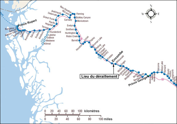La subdivision Nechako commence à Prince George (point milliaire 0,0) et se termine à l'ouest, à Endako (point milliaire 115,4). Le mouvement des trains dans cette subdivision est régi par le système de commande centralisée de la circulation (CCC) en vertu du Règlement d'exploitation ferroviaire du Canada, et est supervisé par le contrôleur de la circulation ferroviaire à Edmonton (Alberta). La vitesse de zone pour les trains de marchandises dans le secteur du déraillement était de 45 mi/h.