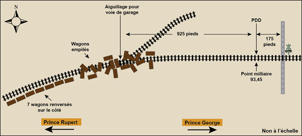 On a déterminé que la roue L2 du 62e wagon, BCNE 900534, s'était brisée et qu'elle avait déraillé sur le côté extérieur du rail nord. Le wagon a ensuite roulé sur une distance d'environ 925 pieds jusqu'à ce qu'il atteigne un aiguillage pour une voie de garage, ce qui a provoqué le déraillement principal. Les 19 wagons précédant le 62e wagon (à l'ouest) et les 16 wagons le suivant (à l'est) ont également déraillé (Figure 2). Les 19 wagons précédant le 62e wagon (à l'ouest) ont déraillé en ligne droite : 7 d'entre eux (du 43e wagon au 49e wagon) se sont renversés sur le côté, en pleine courbe, alors que les 12 autres se sont retrouvés dans diverses positions derrière ces 7 wagons.