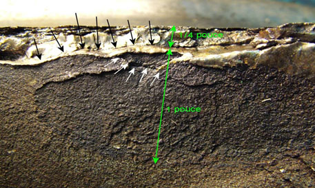 - On peut voir la fissure qui s'est formée sous la surface, parallèlement à la table de roulement et qui a causé l'écaillage. On peut également voir une fissure secondaire qui se propage à partir de la base de l'écaille, perpendiculairement à la table de roulement, vers le centre de la roue.
