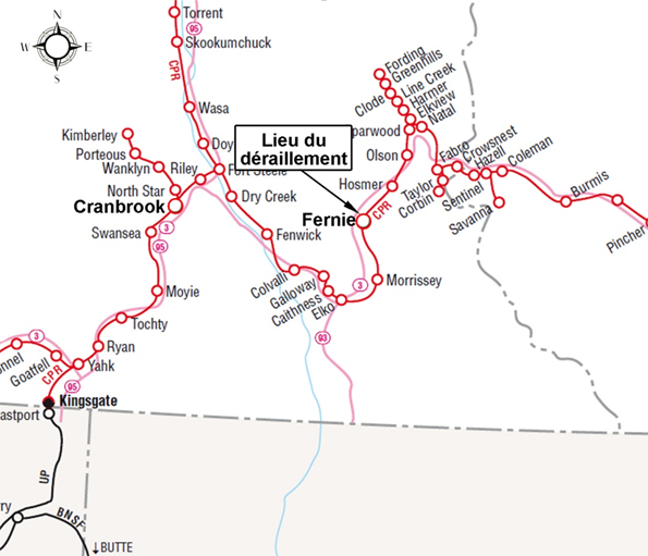 Le 8 mars 2011, à 5 h 15, heure normale du Pacifique, l'équipe du train-bloc no 861-060 du Chemin de fer Canadien Pacifique qui se déplace en direction ouest, signale que le train est en freinage d'urgence au point milliaire 30,0 de la subdivision Cranbrook, près de Fernie, en Colombie-Britannique. Lors de l'inspection, l'équipe constate que 27 wagons chargés de charbon ont déraillé. Personne n'est blessé.