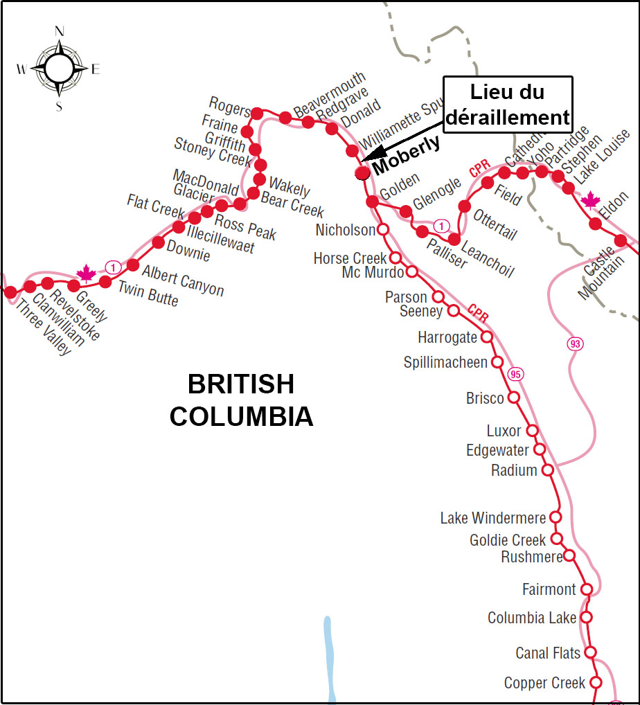 Le déraillement s'est produit dans une zone rurale, à environ 13 kilomètres à l'ouest de Golden, en Colombie-Britannique. La voie, qui longe la route Transcanadienne dans les environs des lieux de l'accident, est constituée d'une voie principale double. Il y a également une voie de garage au nord de la voie principale nord, entre les points milliaires 41,5 et 42,1.