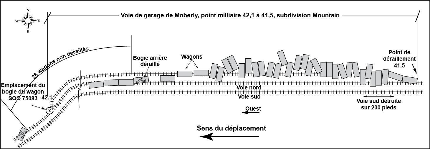 Les 26 wagons suivants n'avaient pas déraillé, et ils étaient suivis par 3 wagons qui avaient déraillé en se plaçant en cordeau. Le bogie arrière du premier des 3 wagons (CP608303) avait déraillé à l'aiguillage est de la voie de garage. Les 30 wagons suivants avaient déraillé en accordéon du côté nord de la voie principale nord (photo 1 et la figure 2).