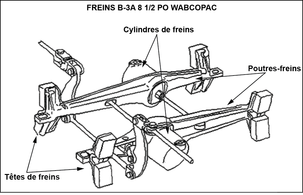 Le wagon SOO75083 était muni de freins B-3-A de 8 1/2 po WABCOPAC, fabriqués par Wabtec (figure 3). Les freins étaient installés sur les bogies et chaque poutre-frein était munie de son propre cylindre de frein. Par comparaison, les freins standards sont actionnés par un cylindre de frein unique fixé à la caisse du wagon.