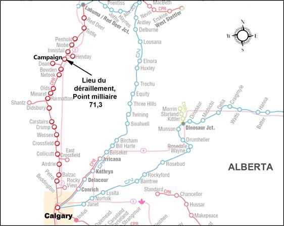 Le 21 avril 2012, vers 1 h 27, heure normale des Rocheuses, alors qu’il roulait vers le nord sur la subdivision de Red Deer, le train de marchandises 200-19 du Chemin de fer Canadien Pacifique est entré sur la voie d’évitement à Campaign (point milliaire 71,30) et 10 de ses wagons-citernes vides ont déraillé. Deux des wagons-citernes déraillés ont heurté la locomotive de tête du train 465-19 du Chemin de fer Canadien Pacifique, qui était immobilisé sur la voie principale. Un wagon-citerne a perdu une petite quantité de glycol. Il n’y a pas eu de blessés.
