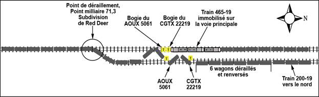 - Le bogie avant du 12e wagon (CGTX 22219) s'est séparé et s'est retrouvé à côté du wagon-citerne. Le bogie arrière de ce wagon a roulé sur la voie principale et s'est immobilisé après avoir heurté la locomotive de tête du train 465 (Figure 2).