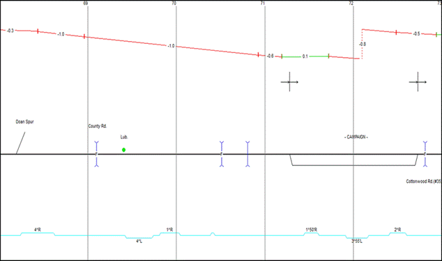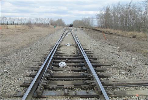 La voie qui mène à l'aiguillage sud de la voie d'évitement à Campaign forme une longue pente (figure 4). La partie la plus raide de la pente (c'est-à-dire, environ 1,0 %) se trouve entre les points milliaires 68,43 et 70,93. L'aiguillage sud de la voie d'évitement est situé sur une voie en alignement au point milliaire 71,3, juste au nord de la portion la plus raide de la pente. À proximité de l'aiguillage, la déclivité passe de 0,6 % (pente) à 0,1 % (rampe), puis à 0,8 % (pente).
