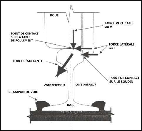 L'interface roue/rail subit une combinaison de forces latérales (L) et verticales (V) lorsqu'un wagon se déplace (figure 5). Le rapport entre les forces latérales et verticales (L/V) fournit une indication du risque de déraillement. La tendance au déraillement augmente à mesure que le rapport L/V augmente. Une force latérale élevée et une force verticale faible (par exemple, des wagons vides qui empruntent une courbe) pourraient faire en sorte que le boudin de roue soit poussé vers le haut et par-dessus la face intérieure du rail ou que le rail soit poussé vers l'extérieur (c'est-à-dire, inclinaison du rail) et même renversé. Les rapports L/V les plus élevés se produisent normalement lors d'une réduction soudaine de la force verticale. Il est reconnu qu'un rapport L/V de 0,80 à 0,90 de durée suffisante peut produire un chevauchement de roues. Note de bas de page 13