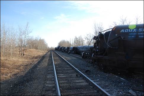 Après avoir transmis les messages d'urgence nécessaires et aviser le contrôleur de la circulation ferroviaire (CCF), l'équipe a inspecté les lieux et a établi que 10 wagons-citernes vides avaient déraillé. Les wagons-citernes avaient contenu en dernier du glycol, un produit chimique non réglementé utilisé dans la fabrication de résines de polyester, de liquides de dégivrage et de fluides caloporteurs.