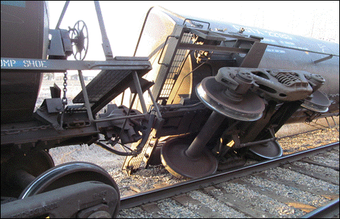 - Lorsque l’état mécanique d’un wagon-citerne rigide en torsion ne permet pas le libre mouvement du bogie sur une voie en courbe, les forces latérales à l’interface roue/rail augmentent ainsi que les risques de déraillement par chevauchement de roues.