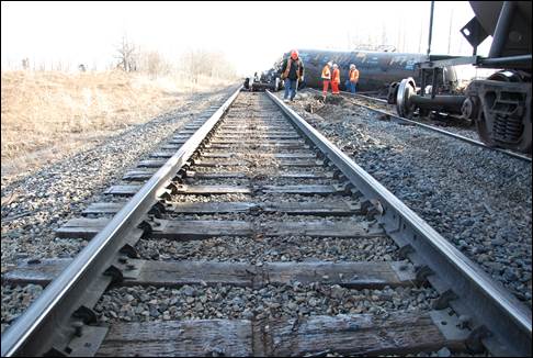 - Six wagons-citernes vides, du 6e au 11e, ont été entraînés hors des rails par le 12e wagon déraillé en raison de leurs attelages à double plateau.