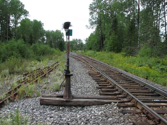 Le branchement situé à l'extrémité nord de la voie d'évitement à Hegadorn est un aiguillage numéro 12 à manœuvre manuelle, conçu pour aiguiller les trains roulant à une vitesse maximale de 15 mi/h. L'appareil de manœuvre a un mât de 48 pouces muni d'une cible standard rouge de forme oblongue et d'une petite cible réflectorisée de couleur rouge qui fait face au nord lorsque l'aiguillage est en position renversée. L'appareil de manœuvre est placé du côté est de la voie, du même côté que l'itinéraire dévié. Un balai d'aiguillage est juxtaposé à l'appareil de manœuvre (photo 1). Les composants de l'aiguillage (figure 2) étaient en bon état, bien ajustés et bien entretenus.