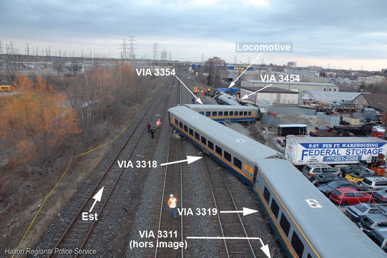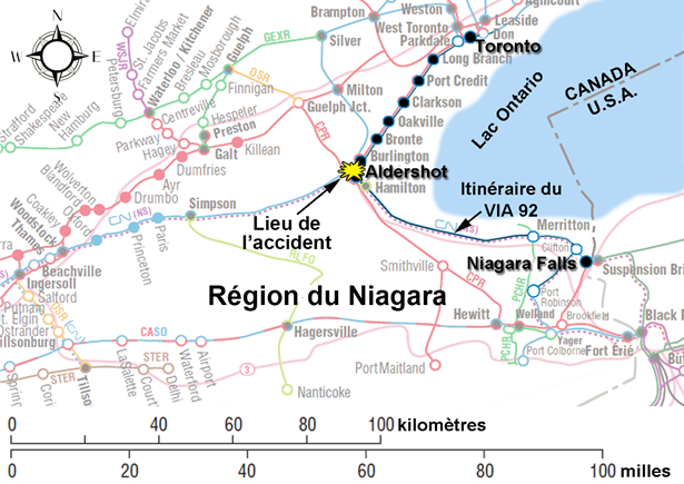 Le 26 février 2012, le train de voyageurs numéro 92 de VIA Rail Canada Inc. (VIA 92) roulait vers l'est, de Niagara Falls à Toronto (Ontario), sur la voie 2 de la subdivision d'Oakville du Canadien National, près de Burlington (Ontario). Sous la conduite de 2 mécaniciens de locomotive et d'un apprenti mécanicien, le VIA 92 transportait 70 voyageurs ainsi qu'un directeur des services de VIA. Après un arrêt à la gare d'Aldershot, en Ontario (point milliaire 34,30), le train est reparti sur la voie 2. Les aiguillages de cette voie étaient orientés de manière à rediriger le train de la voie 2 vers la voie 3 par la liaison no 5 au point milliaire 33,23, où la vitesse autorisée était de 15 mi/h. À 15 h 25 min 43 s, heure normale de l'Est, le VIA 92 a franchi la liaison no 5 à une vitesse d'environ 67 mi/h. Ensuite, la locomotive et les 5 voitures à voyageurs ont déraillé. La locomotive s'est renversée sur le côté et a percuté les fondations d'un bâtiment adjacent à la voie. Les membres de l'équipe d'exploitation ont subi des blessures mortelles, et 45 personnes (44 voyageurs et le directeur des services) ont subi diverses blessures. Le réservoir de carburant de la locomotive a été perforé et a déversé environ 4300 litres de carburant diesel.