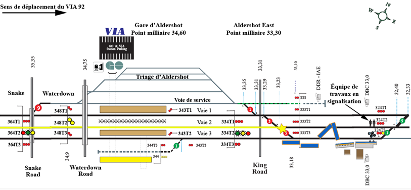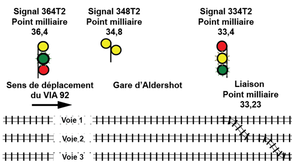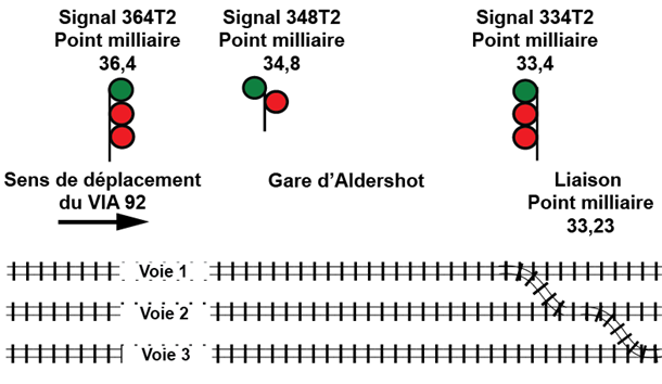 À 15 h 17 min 19 s, le VIA 92 est arrivé à la gare d'Aldershot, un point d'arrêt régulier. Après cet arrêt, le train a été, comme à l'habitude (c'est-à-dire, plus de 99 % du temps), orienté directement pour la voie 2. À 15 h 23 min 26 s, le VIA 92 est reparti pour Toronto sur la voie 2 et a approché du signal contrôlé 334T2 (voir la figure 3).