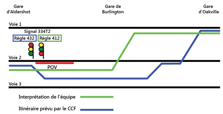 À la demande du chef de la gare d'Oakville de VIA, le CCF avait prévu établir l'itinéraire du VIA 92 de manière qu'il arrive au quai 1 pour faciliter le débarquement du voyageur en fauteuil roulant. Dans sa planification de l'itinéraire du VIA 92 à l'est de la gare d'Aldershot, le CCF avait le choix d'annuler le POV sur la voie 2. Cependant, compte tenu de l'importance de faire réparer le DBC, le CCF a opté pour aiguiller le VIA 92 sur un itinéraire qui contournait la zone d'application du POV sur la voie 2. Par la suite, le CCF a orienté les aiguillages de la voie pour amener le train de la voie 2 à la voie 3 par la liaison no 5 (point milliaire 33,23), où la vitesse autorisée était de 15 mi/h. Le CCF n'a pas communiqué le POV ni le changement d'itinéraire à l'équipe du VIA 92, et il n'était pas tenu de le faire.