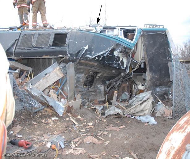 Photo 1. Locomotive VIA 6444 sur le côté et toit effondré de la cabine. Porte du côté du mécanicien responsable sur le dessus (source : police régionale d'Halton).