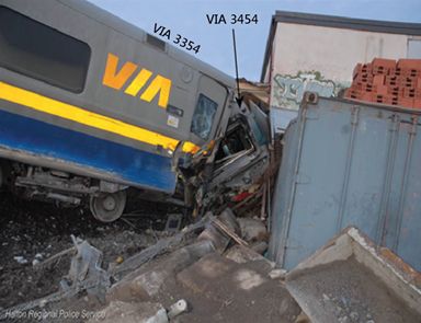 La locomotive et les 5 voitures à voyageurs ont déraillé. Dans les environs du lieu de l'accident, les voies sont situées à un niveau légèrement plus élevé que le terrain adjacent. Au cours de l'accident, la locomotive VIA 6444 et la 1re voiture (VIA 3454) ont glissé en bas du talus, puis se sont renversées et immobilisées sur le côté. Le train et sa conduite de freins à air sont demeurés raccordés et intacts. Le bogie avant de la locomotive s'est trouvé sur le côté du talus, partiellement relié à la locomotive par des câbles. La zone de la cabine de la locomotive, juste au-dessus du nez avant, a percuté les fondations d'un bâtiment adjacent à la voie. Les fondations du bâtiment ont été lourdement endommagées et le toit de la cabine s'est complètement effondré, ce qui a causé des dommages importants à l'intérieur de la cabine (voir la photo 1).