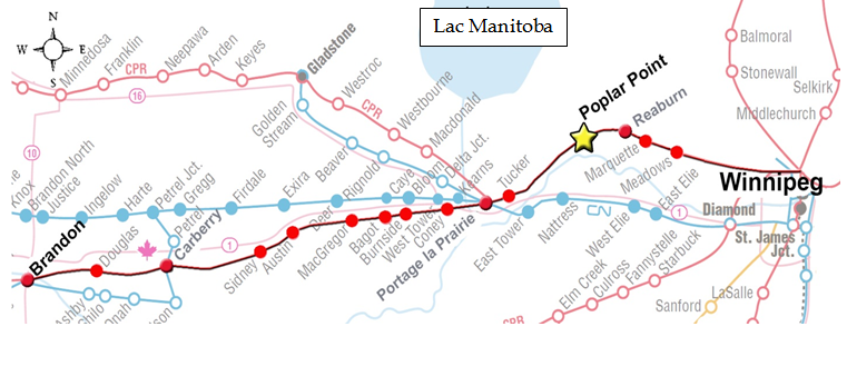 Vers 18 h 10Note de bas de page 1, alors que le train 113 roulait à environ 27 mi/h dans des conditions météorologiques particulièrement mauvaises, l’équipe de train a reçu un appel radio du contrôleur de la circulation ferroviaire du . Le contrôleur a informé l’équipe de la présence de vents violents dans la région et lui a conseillé de prendre les précautions requises. Presque au même moment, un freinage d’urgence provoqué par le train s’est déclenché et la tête du train 113 s’est arrêtée au point milliaire 35,0, à proximité de Poplar Point (Manitoba) (voir la figure 1).