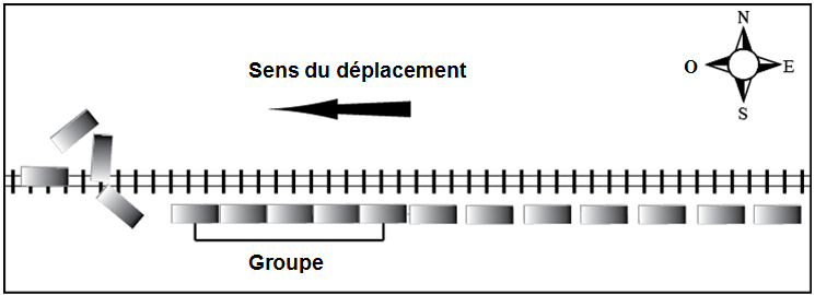 Le premier wagon déraillé était un porte-conteneurs à évidement central unique. Ce wagon était suivi de 3 wagons porte-conteneurs du même type, d’un groupe de 5 wagons (5 caisses de wagons) porte-conteneurs articulés à évidements centraux multiples, puis de 7 autres wagons à évidement central unique. Chacune des 16 caisses de wagons transportait 2 conteneurs empilés vides (à 2 niveaux). Treize caisses de wagons ont déraillé du côté sud de la voie (voir la figure 2).