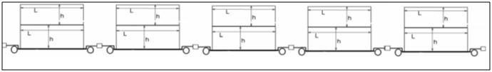 Les wagons à évidement central unique sont munis d’un bogie de wagons de marchandises à chaque extrémité. Lorsqu’ils sont reliés l’un à l’autre, 5 wagons à évidement central unique sont munis d’un total de 10 bogies. Si chaque wagon de ce type transporte des conteneurs empilés de dimensions similaires, la distance entre les conteneurs sur des wagons adjacents est d’environ 23 pieds. La configuration des 5 wagons à évidement central unique est illustrée à la figure 3.