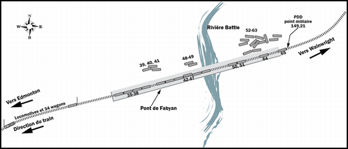 | Wagons | Déraillés sur le pont | Tombés en bas du pont | Déraillés debout sur la culée est du pont |