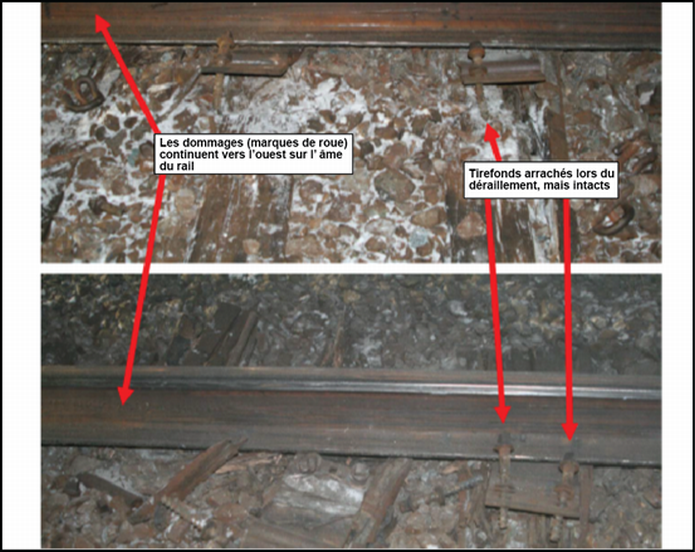 - La défaillance progressive d'uncertain nombre de tirefonds des systèmes de fixation des rails a fait que les tirefonds intacts n'étaient pas assez nombreux pour résister aux forces latérales générées par le passage du train dans la courbe.