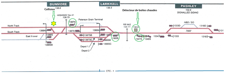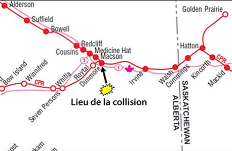 - La collision est survenue lorsque le train 351 a dépassé le signal d'arrêt absolu à Dunmore (Alberta) (signal 1387N), et poursuivi son chemin jusqu'à ce qu'il heurte le côté du train 100 qui franchissait la liaison de la voie principale nord à la voie du dépôt 1.