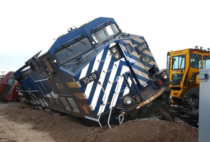 Le train 351 a dépassé le signal d'arrêt absolu d'environ 1100 pieds et a heurté le 39e wagon du train 100. Au moment de la collision, le train 351 roulait à 20,2 mi/h. Les locomotives de tête du train 351 (CEFX 1049, CP 9804) ont déraillé vers le nord et se sont immobilisées à un angle d'inclinaison d'environ 20 degrés et 70 degrés, respectivement (Photo 1).