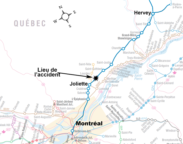 La subdivision Joliette du Canadien National (CN) consiste en une voie principale simple qui va de Garneau (Québec) (point milliaire 40,1) à Pointe-aux-Trembles (Québec) (point milliaire 127,8). Le mouvement des trains est régi par le système de régulation de l’occupation de la voie autorisé en vertu du REF et supervisé par un contrôleur de la circulation ferroviaire à Montréal. Le trafic sur la subdivision est d’environ 5 trains de marchandises et 1 train de voyageurs par jour.