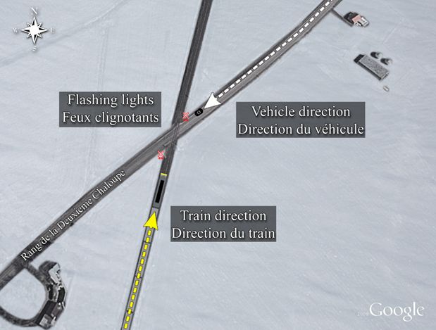 Le rang de la Deuxième-Chaloupe est un chemin rural asphalté à 2 voies et à chaussée unique qui croise la voie ferrée à un angle de 35°/145° (voir la figure 2). Dans des conditions normales, les lignes de visibilité le long de l’emprise ferroviaire ne sont pas obstruées. Le passage à niveau est protégé par des feux clignotants (à incandescence) et une sonnerie. Par beau temps, les signaux lumineux sont visibles à une distance d’au moins 600 pieds par les conducteurs qui approchent du passage à niveau. Des panneaux indicateurs avancés de passage à niveau sont placés à environ 600 pieds du passage à niveau, le long de l’approche routière dans les 2 sens, et sont visibles d’une distance d’au moins 600 pieds par les conducteurs qui approchent. La vitesse maximale permise sur cette route est de 80 km/h.