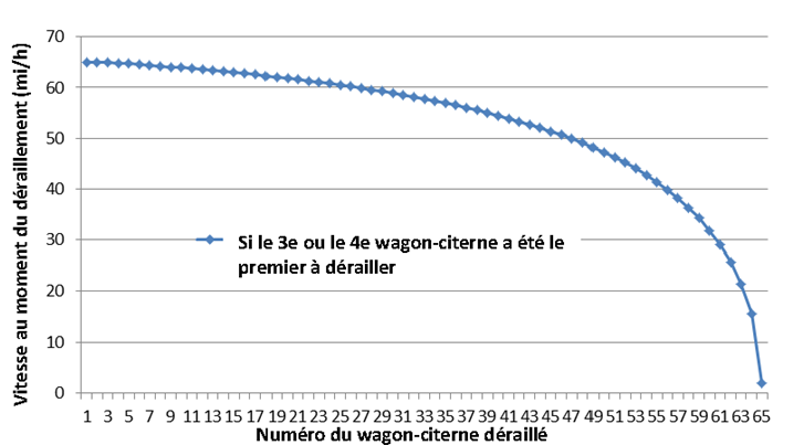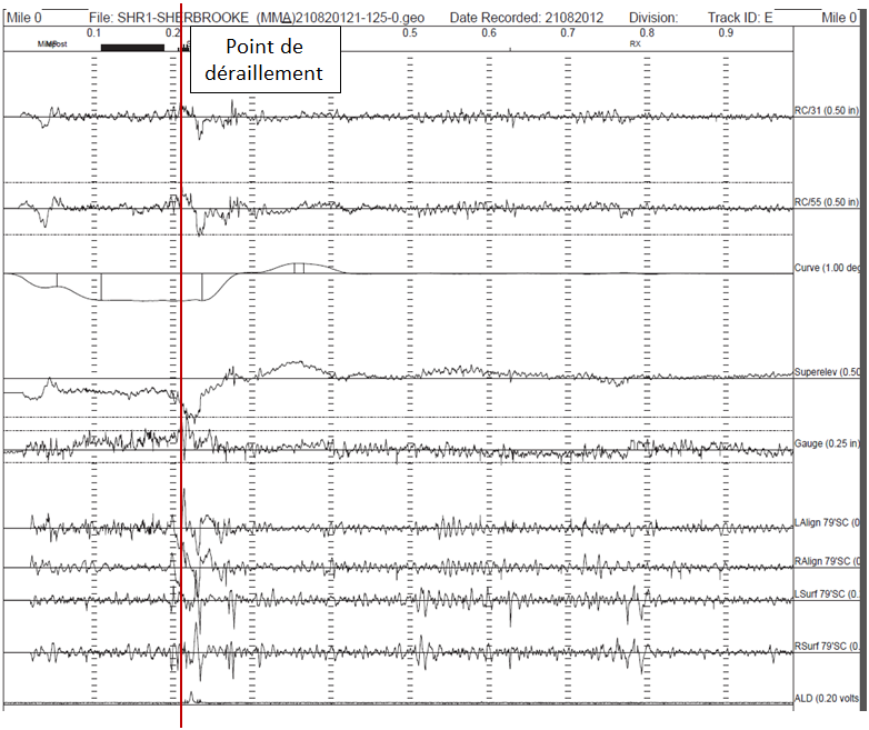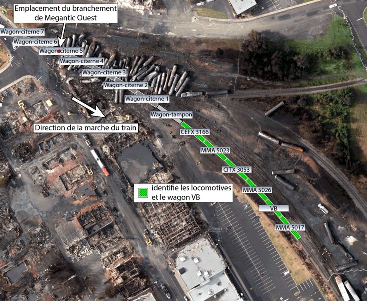 Le groupe de traction n’a pas déraillé, mais il s’est séparé du reste du train puis s’est divisé en 2 sections. Les données téléchargées du passage à niveau de la rue de la Gare (à côté de la gare Megantic) ont révélé que les 2 sections l’ont traversé à 104 pieds l’une de l’autre. Les 2 sections ont continué de rouler en direction est jusque sur la subdivision Moosehead, arrêtant leur course sur une pente ascendante dans l’est de la ville, à environ 475 pieds l’une de l’autre. Au cours du déroulement de ces événements, le train a franchi 13 passages à niveau.