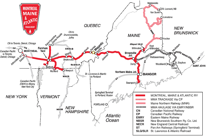 Figure 1. Carte de la Montreal, Maine & Atlantic Railway (MMA) (source : MMA, modifiée par le BST)
