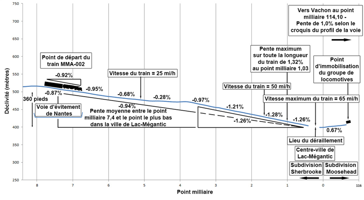 Entre Nantes et Megantic (du point milliaire 7,40 au point le plus bas près du point milliaire 0,00), la pente descendante moyenne était de 0,94 %, et la pente la plus raide sur la longueur du train était de 1,32 % au point milliaire 1,03 (figure 2). La déclivité était d’environ 360 pieds entre Nantes et Megantic. Sur les 2 derniers milles avant le point de déraillement (PDD), la voie accusait une pente descendante d’environ 1,30 %. La courbure horizontale maximum de la voie, qui était de 4,25°, se trouvait à l’endroit où le déraillement s’est produit (rapport du laboratoire d’ingénierie LP167/2013).