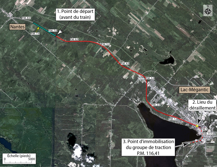 Carte qui indique les 3 endroits sur lesquels l'enquête s'est concentrée : Nantes, le centre-ville de Lac-Mégantic et point milliaire 116,41 de la subdivision Moosehead