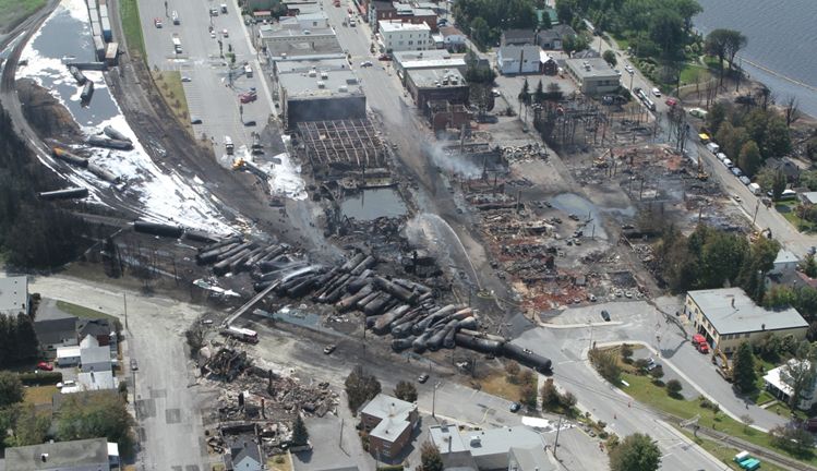 Image aérienne du site du déraillement à Lac-Mégantic après l'accident