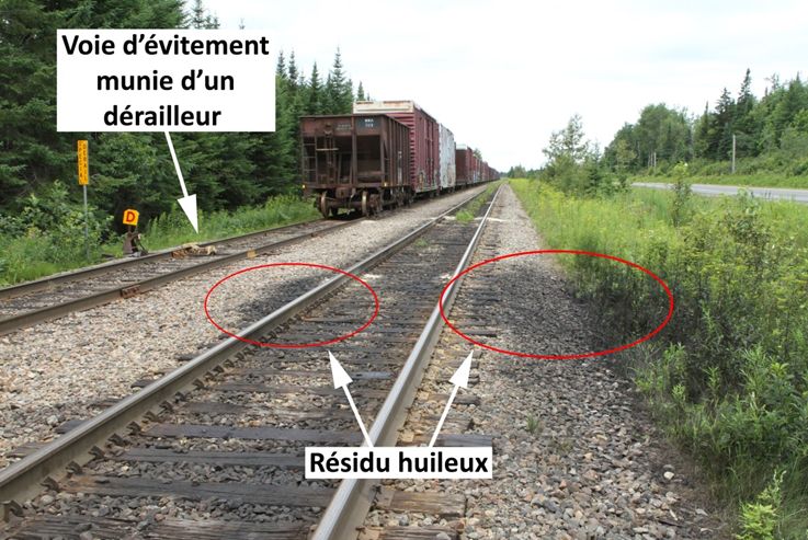 Photo 3. Résidu huileux sur le sol et la végétation à Nantes. À noter, le dérailleur sur la voie d'évitement adjacente à gauche (vue en direction ouest à partir de l'endroit où la locomotive de tête était garée sur la voie principale)