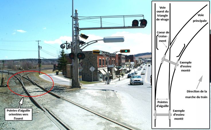 La gare Megantic de la MMA se trouvait dans une zone commerciale de Lac-Mégantic, où les subdivisions Sherbrooke et Moosehead se rejoignaient. La rue Frontenac, une artère principale, passait en plein centre de la ville. La voie principale traversait la rue Frontenac juste à l’ouest du branchement de Megantic Ouest et était entretenue pour une vitesse maximum de 15 mi/h. Le branchement se trouvait au point milliaire 0,23, et les pointes d’aiguille étaient orientées vers l’ouest (photo 4).