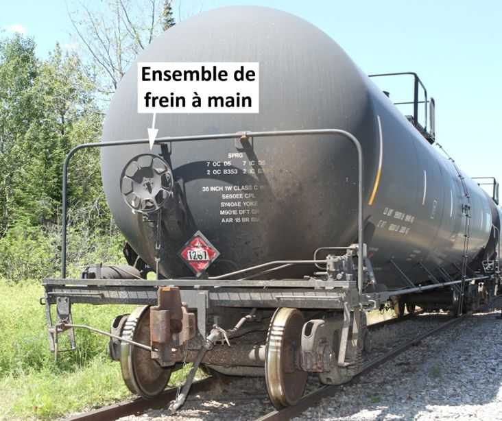 En matinée le 5 juillet 2013, les wagons-citernes ont été conduits jusqu’à Farnham, où ils ont fait l’objet d’un essai de la continuité des freins et d’une inspection mécanique de TC. Des défauts mineurs ont été relevés sur 2 wagons, et ils ont été corrigés. Lorsqu’il est parti de Farnham, le train mesurait environ 4700 pieds, pesait environ 10 290 tonnes (annexe B) et était constitué du matériel suivant (photo 2) :