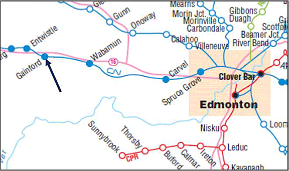 La voie d'évitement de Gainford est une voie d'évitement signalisée longue de 16 896 piedsNote de bas de page 6 où la vitesse autorisée est de 25 mi/h. Cette voie est 1 des 7 voies d'évitement signalisées sur la subdivision Edson. En 2013, la subdivision Edson a transporté un trafic d'environ 100 millions de tonnes brutes (MTB), dont 12 à 15 MTB ont emprunté la voie d'évitement de Gainford.