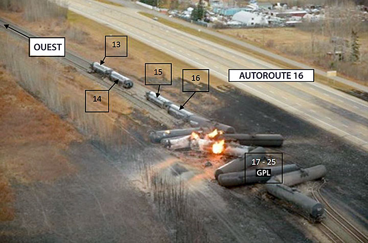 Les 4 wagons-citernes DOT 111 en cause dans l'événement (wagons 13 à 16) se sont renversés au nord de la voie d'évitement et se sont arrêtés sur la voie principale. Il est probable que le 16e wagon a été le premier à dérailler. Notamment en raison des attelages à double plateau, des forces en torsion ont agi sur les 3 wagons précédents, causant leur déraillement. Les 4 wagons-citernes DOT 111 se sont arrêtés avant le point de déraillement principal et ils n'ont pas été heurtés par d'autres wagons déraillés ni directement endommagés par l'incendie et les explosions qui ont suivi. Compte tenu de l'alignement longitudinal de ces wagons au moment où ils se sont renversés sur la voie principale, de l'absence d'impact secondaire et du fait qu'ils n'ont pas été exposés à l'incendie et à l'explosion des wagons qui ont déraillé par la suite, les 4 wagons-citernes DOT 111 construits selon les normes CPC-1232 n'ont pas été lourdement endommagés au cours du déraillement.