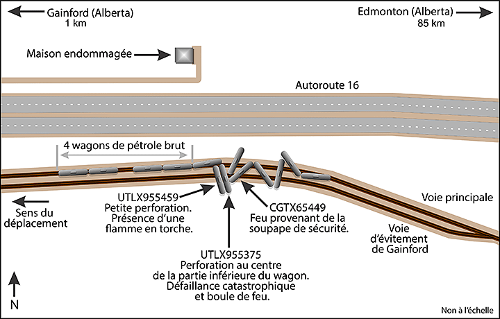 Vers 1 hNote de bas de page 1, alors qu'il roulait sur la subdivision Edson, le train est entré dans la voie d'évitement de Gainford en vue d'un croisement avec le train 416 qui se dirigeait vers l'est. Il avait franchi environ 3300 pieds dans la voie d'évitement quand il s'est produit un freinage d'urgence en provenance de la conduite générale. Une fois le train arrêté, l'équipe a regardé vers l'arrière du train et a remarqué que des flammes s'en dégageaient. L'équipe a dételé les locomotives du reste du train et quitté la zone immédiate alors que l'incendie gagnait en intensité. L'équipe a ensuite lancé le message d'urgence nécessaire et avisé le contrôleur de la circulation ferroviaire. Il n'y a pas eu de blessés.