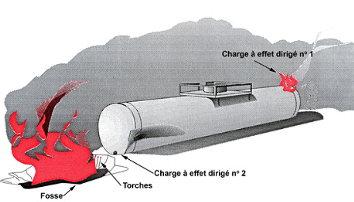La procédure proprement dite consiste à placer 2 charges explosives sur le wagon-citerne touché. Une des charges est placée sur le point le plus élevé d'une des extrémités du wagon, communément appelé « espace vapeur ». L'autre charge est placée à l'extrémité opposée du wagon et en son point le plus bas, communément appelé « espace liquide ». On fait tout d'abord exploser la charge de l'espace vapeur. La charge perce un trou dans la paroi de la citerne, enflamme les vapeurs à mesure que celles-ci s'échappent dans l'atmosphère et fait baisser la pression à l'intérieur de la citerne. Dès que la pression a baissé, on allume la seconde charge. Cette dernière charge perce un trou dans l'espace liquide, ce qui fait que le gaz liquéfié peut sortir de la citerne et s'écouler dans une fosse creusée au préalable, d'où il est brûlé (figure 4).