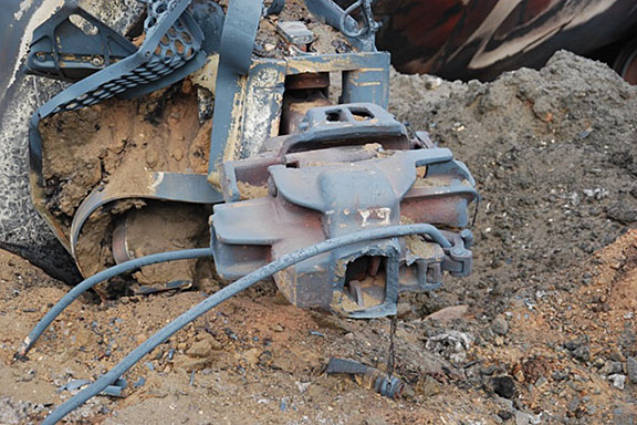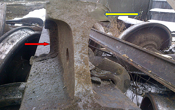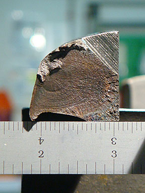 La voie d'évitement de Peers est 1 des 7 voies d'évitement où la limite de vitesse est de 25 mi/h dans la subdivision Edson. Au moment de l'examen du site de l'accident, on a découvert un morceau de rail 1996 Bethlehem avec DFT à environ 12 pouces d'une soudure aluminothermique (photo 10). Le champignon du rail présentait 18 mm d'usure et le côté extérieur, 5 mm d'usure. Un autre DFT a été constaté à proximité sur un autre morceau du même rail. Les deux morceaux de rail étaient écrasés, ce qui indique que le rail s'était rompu et était resté sur la voie jusqu'à ce que d'autres morceaux se rompent au passage des roues. Le rail provenait d'un railNote de bas de page 30 de raccord situé dans le rail sud (haut) de la voie d'évitement près du point où la voie en alignement amorce une courbe de raccordement menant à l'aiguillage est. Le rail parent était un rail 1987 Sydney en acier au carbone avec une perte de 18 mm du champignon et une usure de 1 mm du côté extérieur. Tous les rails en cause étaient de 136 livres avec peu d'écaillage et de fissuration du congé de roulement.