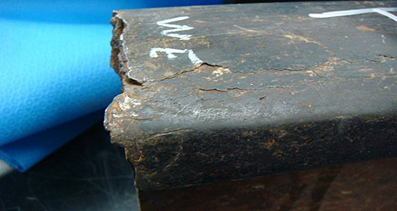 - La taille critique de l'un des défauts transversaux a été atteinte lorsque la zone restante du champignon du rail, qui avait atteint ou presque atteint sa limite d'usure, n'a plus été en mesure de soutenir la charge, ce qui a entraîné la défaillance soudaine et complète du rail.