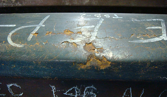 - Les dommages à la surface des rails, comme l'écaillage et les criques, semblent avoir grandement empêché la détection des défauts, réduisant le rendement de l'équipement à ultrasons utilisé pour détecter les défauts internes.