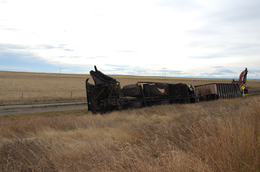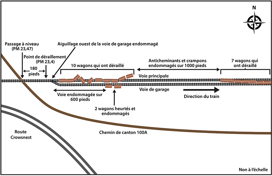 Juste avant le déraillement, un freinage d'urgence provenant de la conduite générale a été déclenché. Après avoir transmis les messages d'urgence nécessaires et avoir avisé le contrôleur de la circulation ferroviaire (CCF) à Calgary, le chef de train a inspecté le train et a constaté que les 17 derniers wagons avaient déraillé, en 2 groupes. Les 10 derniers wagons avaient déraillé à l'aiguillage ouest de la voie de garage de Pearce (figure 2). Certains d'entre eux ont heurté 2 wagons-tombereaux vides qui étaient remisés sur la voie de garage adjacente à la voie principale (photo 2). Les 7 autres wagons qui ont déraillé ont été traînés vers l'est sur environ 1000 pieds et sont restés debout.