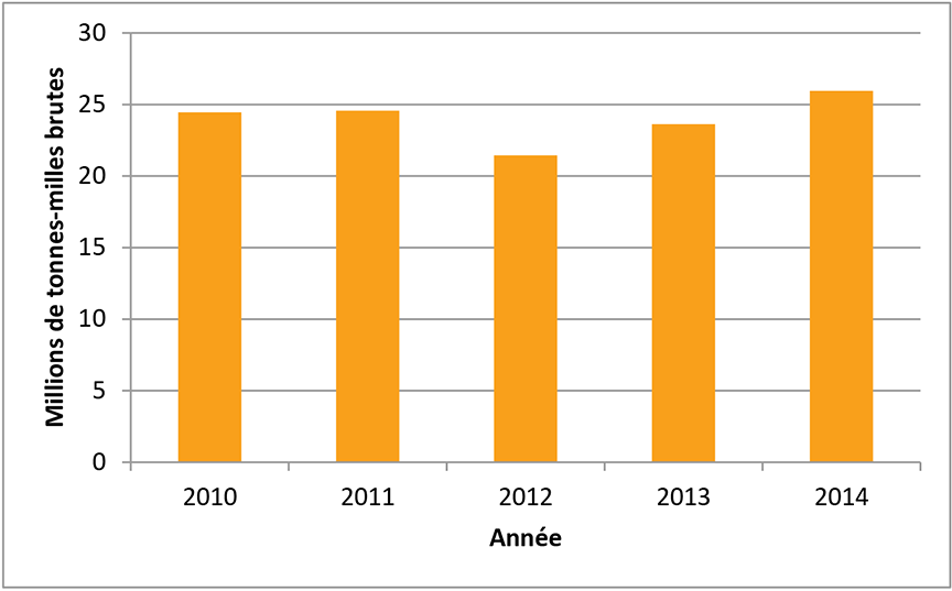 Le trafic ferroviaire dans la subdivision de Crowsnest est principalement composé de trains de céréales et de charbon. Il s'élevait à environ 26 millions de tonnes-milles brutes (MTMB) en 2014 (figure 3).