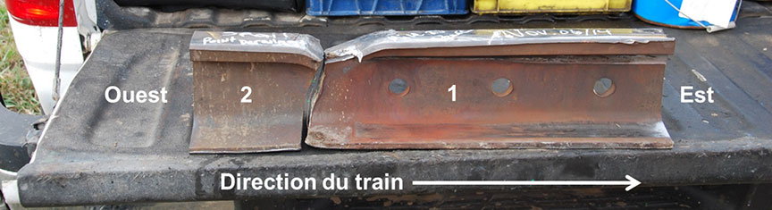 - Les surfaces des 2 morceaux de rail présentaient des dommages par impact de roue, mais ils étaient plus graves sur le morceau de rail no 1. Cela indique que la rupture du rail s'est produite avant l'événement à l'étude et que les roues la martelaient dans les 2 directions.